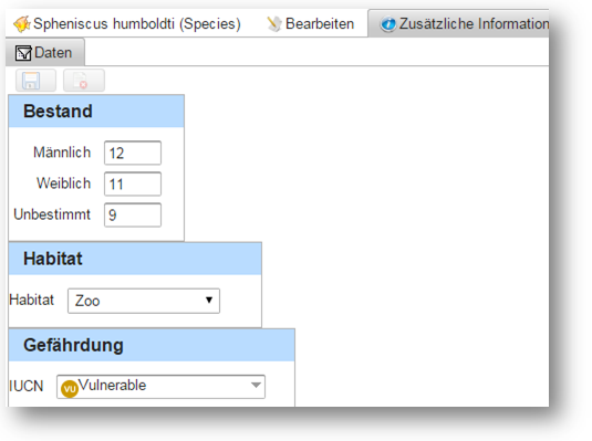 Das TreeDB-SDK erlaubt es, benutzerdefinierte Eingabefelder mit einem vorgegebenen Layout zu verbinden. Im Beispiel der Zoo-Datenbank wurde der Knotentyp Spezies, bestehend aus einem WIKI-Teil, um eine Gruppierung an Eingabefeldern ergänzt, die die Zoo-spezifischen Daten enthält.